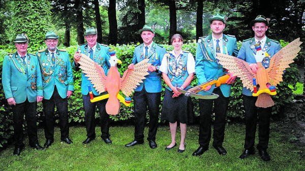 Im Herbst hatten die Schützenbrüder Karsten Eilers und Markus Brand, von Beruf Tischler und Zimmermann, vom Vorstand den Auftrag erhalten, hölzerne Adler nach den festgelegten Kriterien für das Königsschießen und das Kinderkönigsschießen zu bauen. Die beiden Handwerker waren in der hauseigenen Werkstatt viele Stunden mit Sägen, Bohren, Schleifen, Kleben und Malen beschäftigt, um den Auftrag zu erfüllen. Als sie ihre Arbeit abgeschlossen hatten, informierten sie den Vorsitzenden des Schützenvereins, Bernd Eilers, und vereinbarten einen Übergabetermin, zu dem sämtliche Vereinsoffizielle eingeladen wurden. Unter dem Kommando von Hauptmann Heiner Lübbers-Siemer trafen sich Vorstand, Zugführer, Fahnenträger und Festausschuss beim Vereinsheim und marschierten mit Königin Brigitte Tiedeken an der Spitze zu den Adlerbauern im Hause Eilers, um die Vögel zu übernehmen. Als die beiden Adlerbauer ihre Holzvögel enthüllten, ging ein Raunen der Bewunderung durch die Reihen der Schützen. Königin Brigitte lobte die Adler als meisterliches Kunstwerk, Vereinsvorsitzender Eilers nickte zustimmend und meinte: „Die Regularien sind auch trotz des Lobes der Königin einzuhalten und es muss geprüft werden, ob die Adler exakt entsprechend der ,Reichsnorm’ gefertigt wurden.“ Mit einem Zollstock wurde alles nachgemessen. „Hier ist millimetergenau gearbeitet worden“, resümierte der Vorsitzende. Bei der Inaugenscheinnahme hatte er auch festgestellt, dass die Holzvögel „scharfe Augen“ und „spitze Greife“ haben, um rechtschaffene Regenten zu finden. Auch Krone, Zepter und Reichsapfel seien fest montiert und das Holz sei wurmfrei, betonte der Vorsitzende. Er akzeptierte im Namen aller Schützen die Adler und lobte und dankte Brand und Eilers als Meister hoher Handwerkskunst, die sich durch ihr ehrenamtliches Schaffen sehr um den Verein verdient gemacht hätten. Eilers terminierte das Königsschießen mit dem Kleinkalibergewehr auf Ende Juli 18 Uhr. Das Kinderkönigsschießen wird zuvor ab 15 Uhr durchgeführt. Die Kinder haben zudem die Möglichkeit ab 14 Uhr zu üben, sie ermitteln ihre Majestät traditionell mit der Armbrust. Eilers ersuchte Königin Brigitte, das Schießen auf dem Schützenplatz zu eröffnen. Um 16 Uhr vor dem Königsschießen startet in der Schießhalle das Pokalschießen mit dem Luftgewehr in den unterschiedlichen Altersklassen. Zum Königsschießen, das Volksfestcharakter hat, ist die gesamte Kamper und Ikenbrügger Bevölkerung eingeladen. Diverse Stände sorgen für das leibliche Wohl.